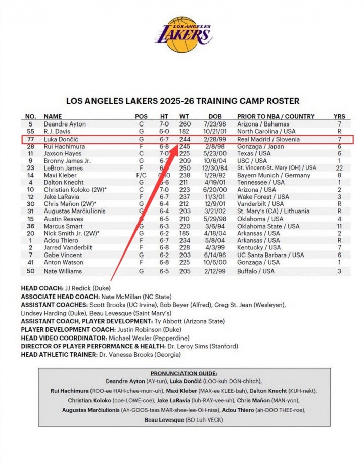 湖人训练营名单东契奇体重244磅 上赛季开赛230磅&最高270磅