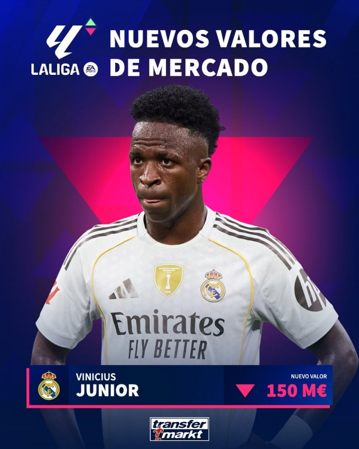 再度下跌!德转今日更新西甲身价,维尼修斯下跌2000万至1.5亿欧